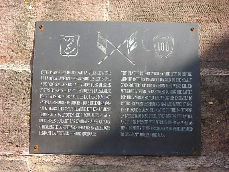 La forteresse bitchoise résista à l’ennemi lors des attaques de 1793, 1814, 1815 et surtout durant le siège héroïque de 1870, tenu par le commandant Louis-Casimir Teyssier. Aussi peut-elle inscrire sous l’écu sur une banderole en lettres d’or la devise de la ville de Nancy : « Qui s’y frotte s’y pique » ou la devise particulière : « Je mords derrière comme devant ». Enfin, la ville de Bitche peut faire figurer en bas des armoiries la Légion d'honneur, reçue le 14 juin 1919 et la Croix de guerre 1939-1945.