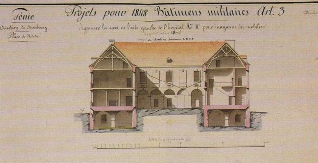 Il s'agit d'un bâtiment en grès, qui comporte lors de sa construction deux corps parallèles bordant une cour, couverts de toits à longs pans et croupes. À la fin du XVIIIe siècle, vers les années 1797-1798, il est reconstruit dans sa forme actuelle : trois corps en U entourant une cour pavée, fermés sur la rue par un corps de passage, dont le décor du portail est resté en attente. Un relevé établi en 1847 - conservé aux archives du Génie à Vincennes - à l'occasion de travaux d'aménagements, nous montre en détail l'élévation du corps central, percé au premier niveau d'arcades en plein cintre appareillées, qui sont en partie fermées dès cette époque. Le deuxième niveau est éclairé par de hautes baies rectangulaires décorées d'une agrafe, un type d'ouverture qui se retrouve sur les autres façades donnant sur la cour et sur la citadelle. Un parti de symétrie très rigoureux caractérise la façade sur rue du bâtiment Rocca. Le solin en pierre de taille de grès rose et les chaînes d'angle harpées structurent cette architecture sévère, dont le portail central constitue le seul élément décoratif avec ses guirlandes végétales et ses consoles à gyphes terminées par des gouttes. Apparenté aux hôpitaux civils par son plan, cet édifice militaire emprunte néanmoins à l'achitecture locale les lucarnes du corps de passage tandis que son élévation sur rue rappelle le parti classique des hôtels urbains depuis le XVIIe siècle.