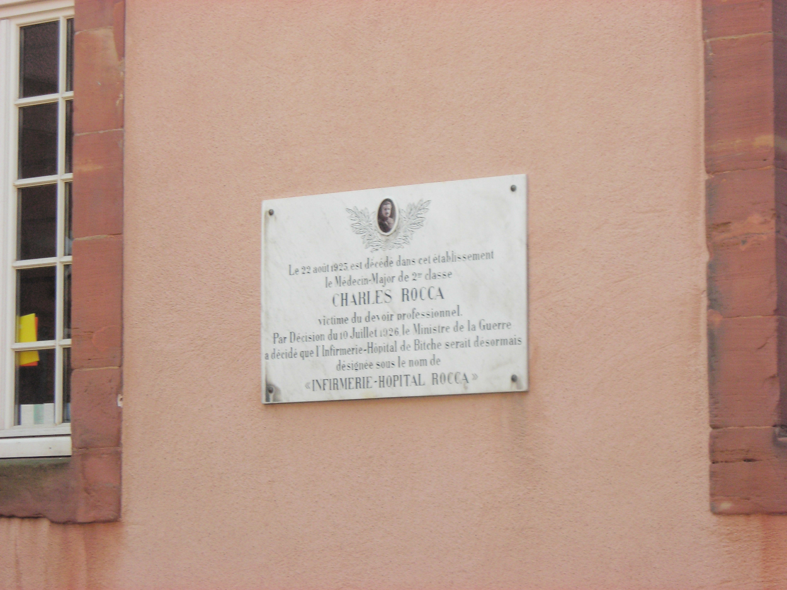 Le bâtiment doit son nom au Médecin-Major de 2e classe Charles Rocca, décédé le 22 août 1925 dans cet établissement, victime du devoir professionnel. Le Ministre de la Guerre Paul Painlevé (1863-1933), par décision du 10 juillet 1926, a décidé que l'hôpital militaire de Bitche serait désormais appelé « Infirmerie-Hôpital Rocca ». Une plaque commémorative, installée dans la cour pavée du bâtiment, rappelle aujourd'hui encore ces événements. Situé en plein cœur de la ville, ce bâtiment conséquent comporte cinq niveaux et dispose sur l'arrière d'un jardin avec une partie médicinale, au pied de la citadelle. La municipalité décide en avril 1992, afin de préserver et de réhabiliter cet édifice, de le reconvertir en médiathèque. Le bâtiment est renommé en 2010 « médiathèque Joseph-Schaeffer », du nom du maire de Bitche à l'origine de la restauration de l'ancien hôpital et de sa transformation en lieu de culture.