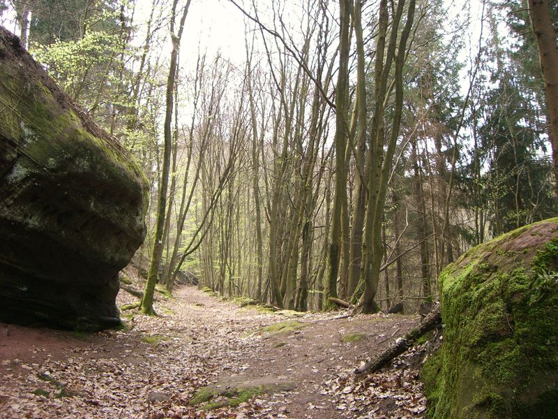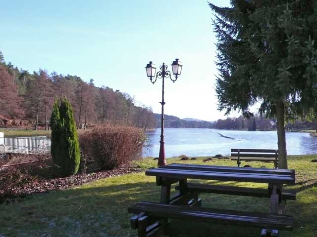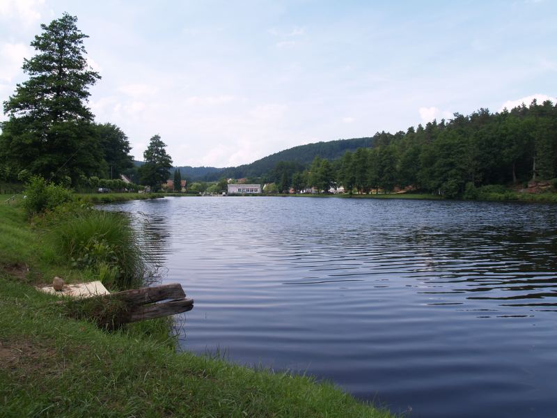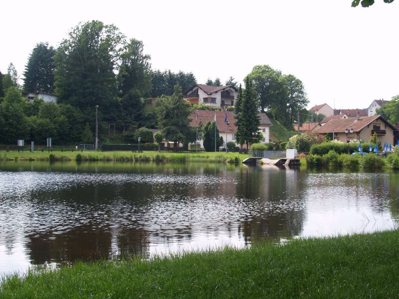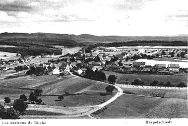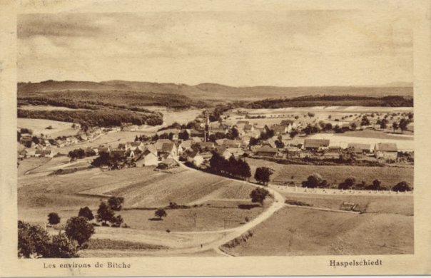 Situé au Nord-Est de la ville de Bitche, en plein pays couvert, le petit village de Haspelschiedt et son grand ban forestier sont traversés par le Schwartzenbach, un ruisseau qui alimente un magnifique étang, long de plus de deux kilomètres, et fort apprécié des pêcheurs de la région. Pour nous abandonner aux plaisirs de l'eau et de la baignade, il nous suffit de suivre la cohorte de voitures étrangères qui, venant de la frontière allemande, se dirige vers le village. Au bord du lac s'est installé un véritable village de toile. Les touristes ne savant pas qu'en decendant vers la pièce d'eau, ils passent à côté du Goetzengarten et du Heiligengarten et franchissent du même coup une très ancienne frontièe de catholicité dont la toponymie a gardé la trace. Ils ignorent sans doute aussi que les nombreux étangs de la région et leurs lits de marécages constituaient des zones de typhoïde et de typhus, à telle enseigne que le roi Louis-Philippe dut en faire assécher plusieurs.