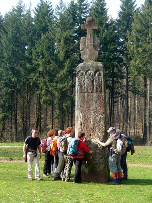 Bien plus tard, on complète le monument d'un groupe de 1 mètre 50 de haut, représentant le Seigneur Jésus en Croix, flanqué de la Très Sainte Vierge Marie et de sainte Marie-Madeleine à ses pieds. Au dessous, sur le pourtour, les Douze Apôtres, en relief, trois sur chaque face, semblent veiller sur la forêt en regardant les quatre horizons. Ces sculptures sont tardives puisqu'elles sont sans doute ajoutées au XVIIIe siècle, peut-être même en 1787, si l'on en juge par l'inscription placée au-dessus de cette date. Elle reproduit sur quatre lignes le nom des douze apôtres, le tout dans une orthographe germanique. Certaines personnes assurent que cet embellissement est du à un riche marchand de vin d'Ingwiller, en remerciement au bon Dieu pour un bienfait reçu.