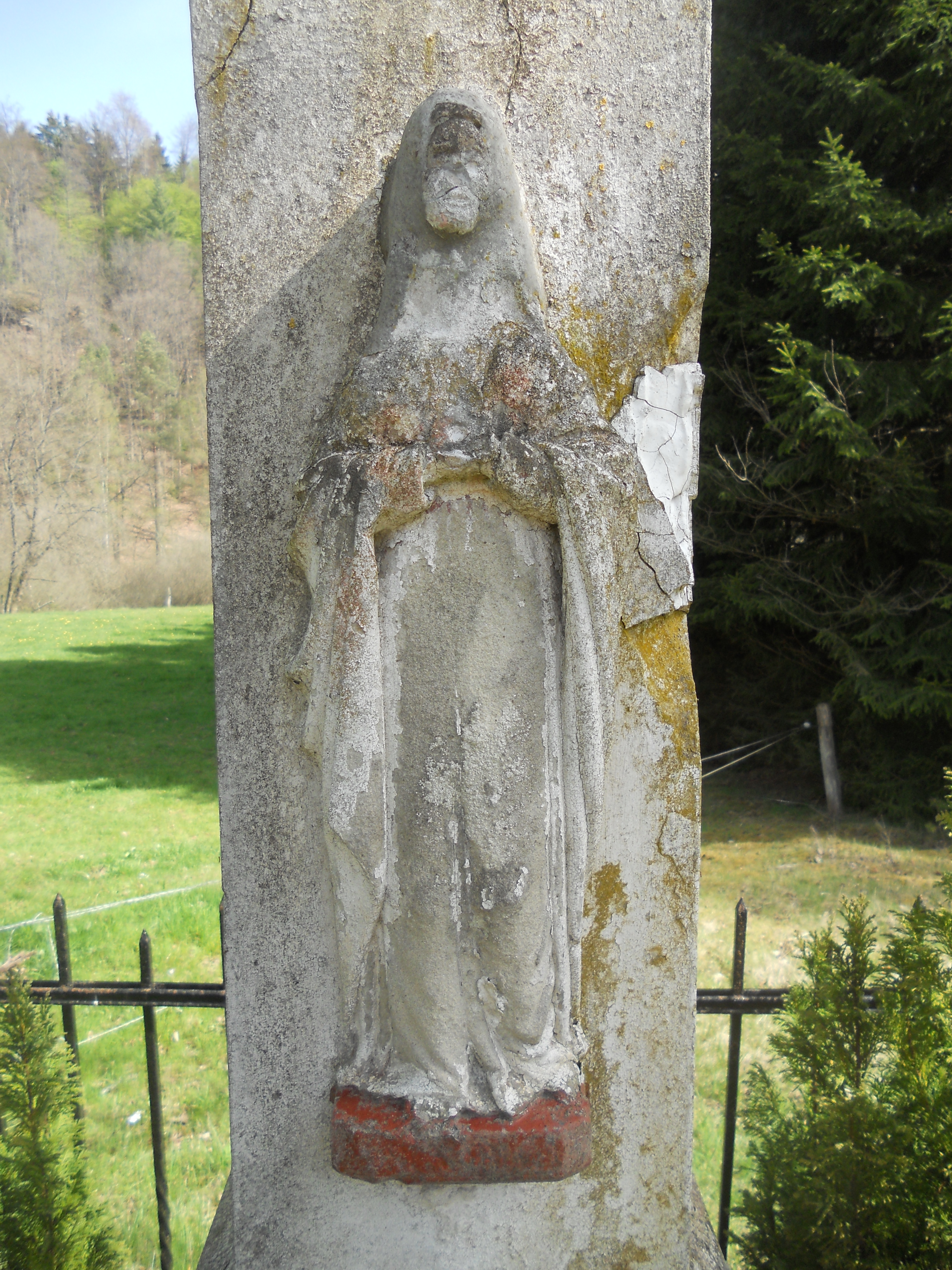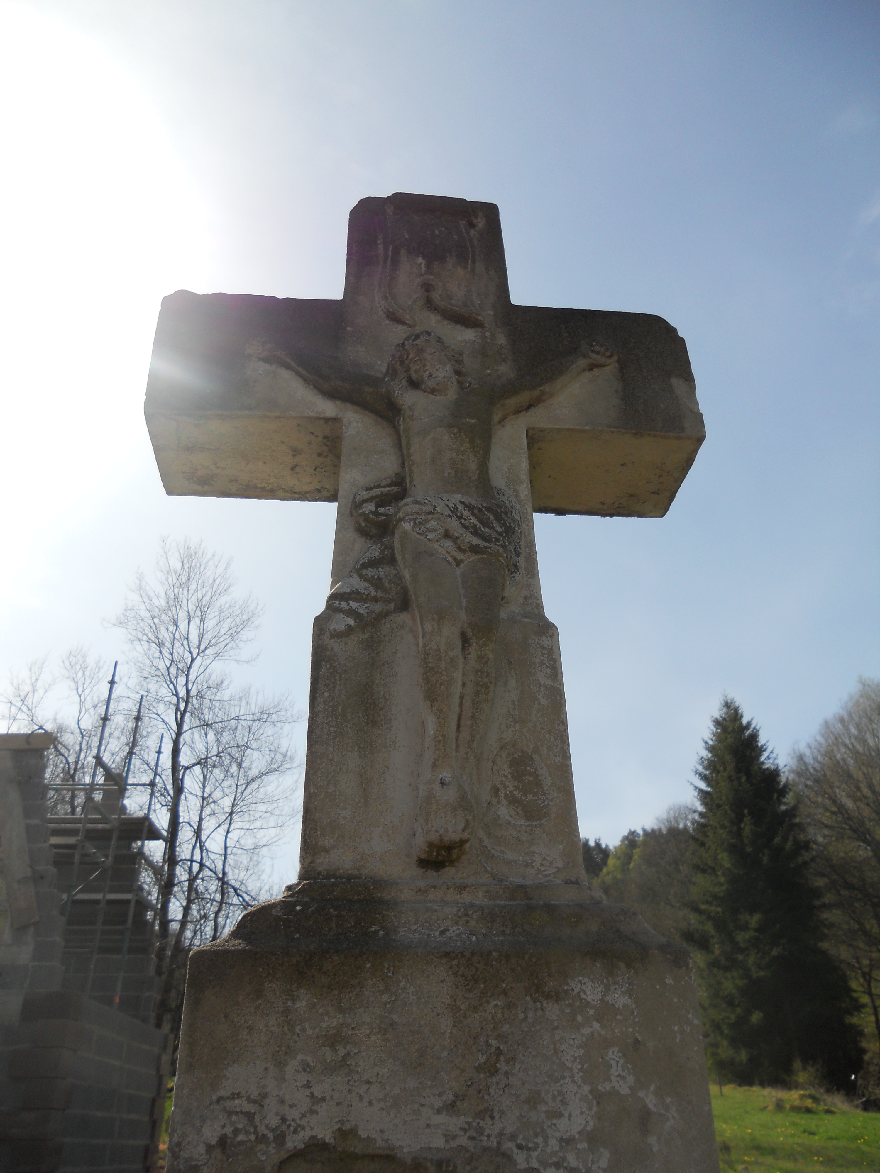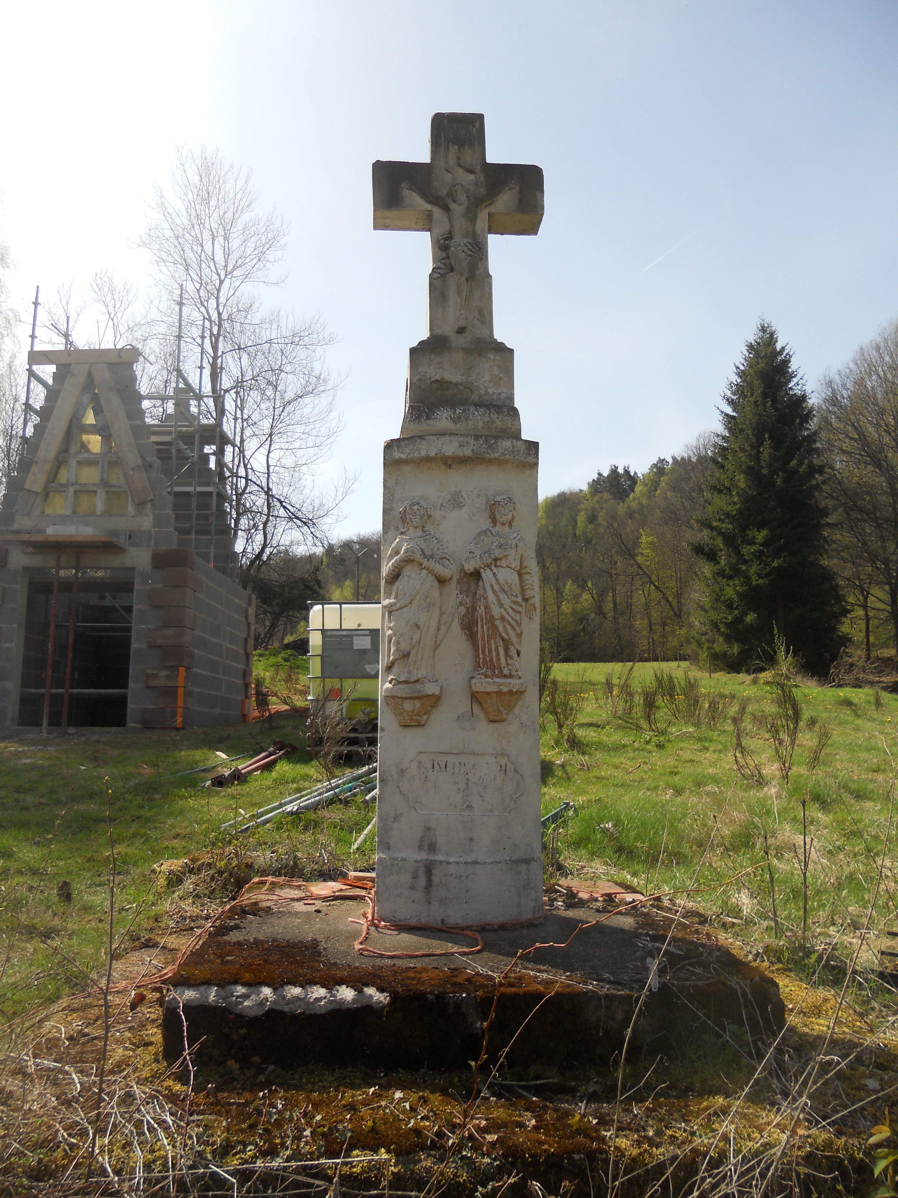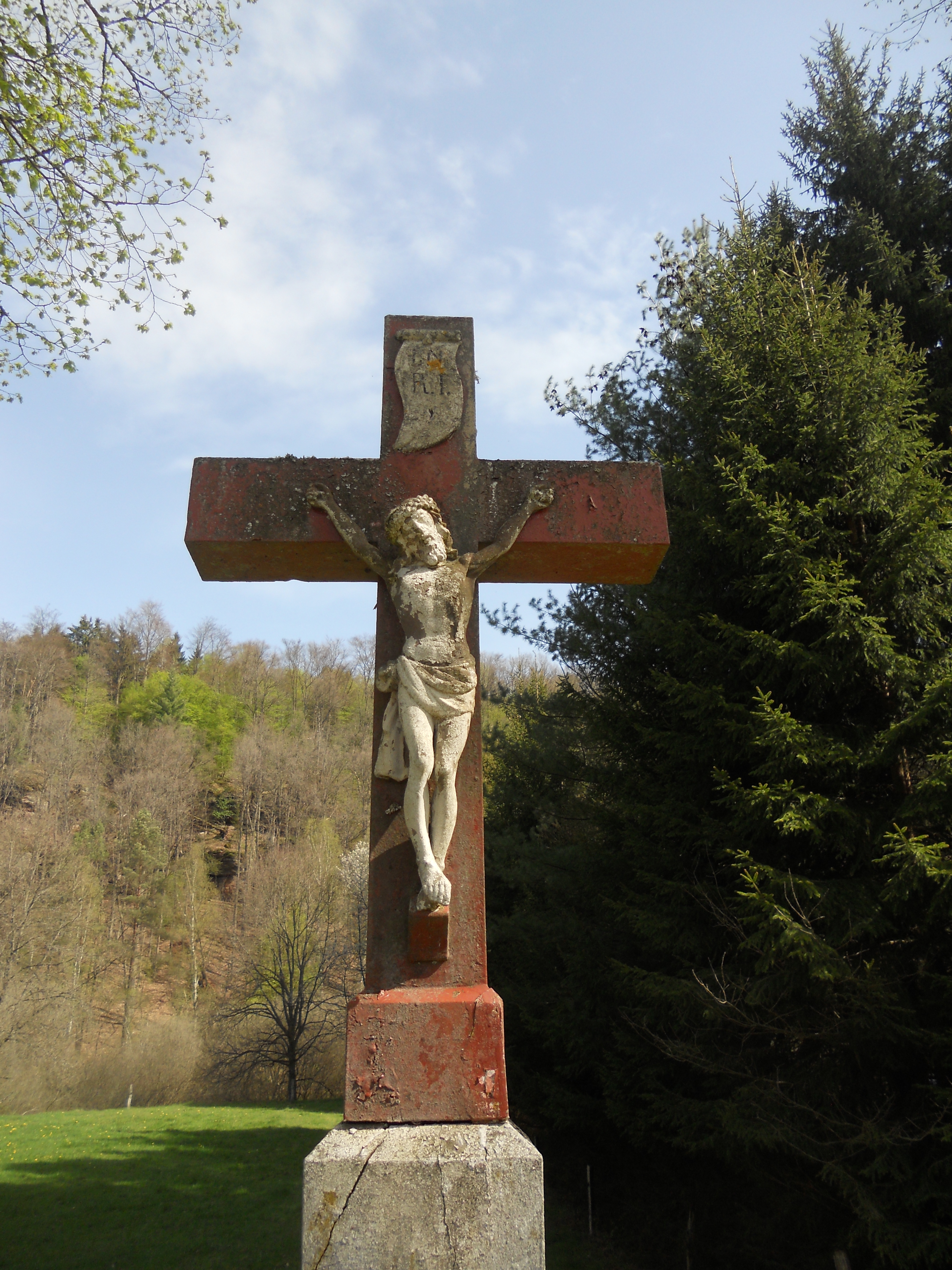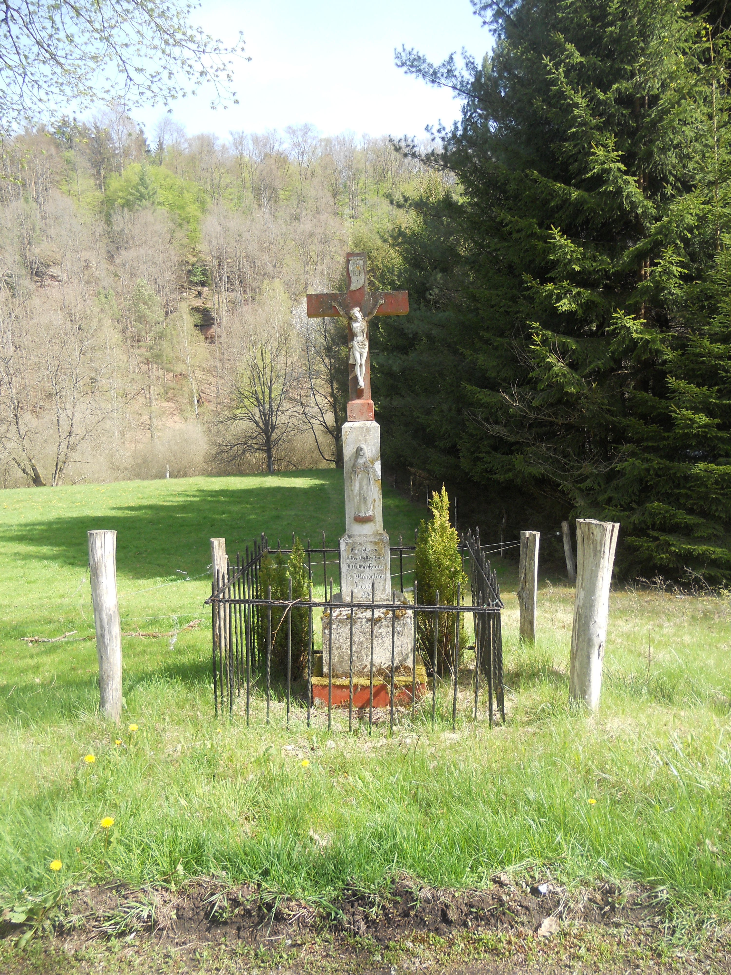 l'entrée. Un socle en grès rose est surmonté d'une croix en bois, portant un