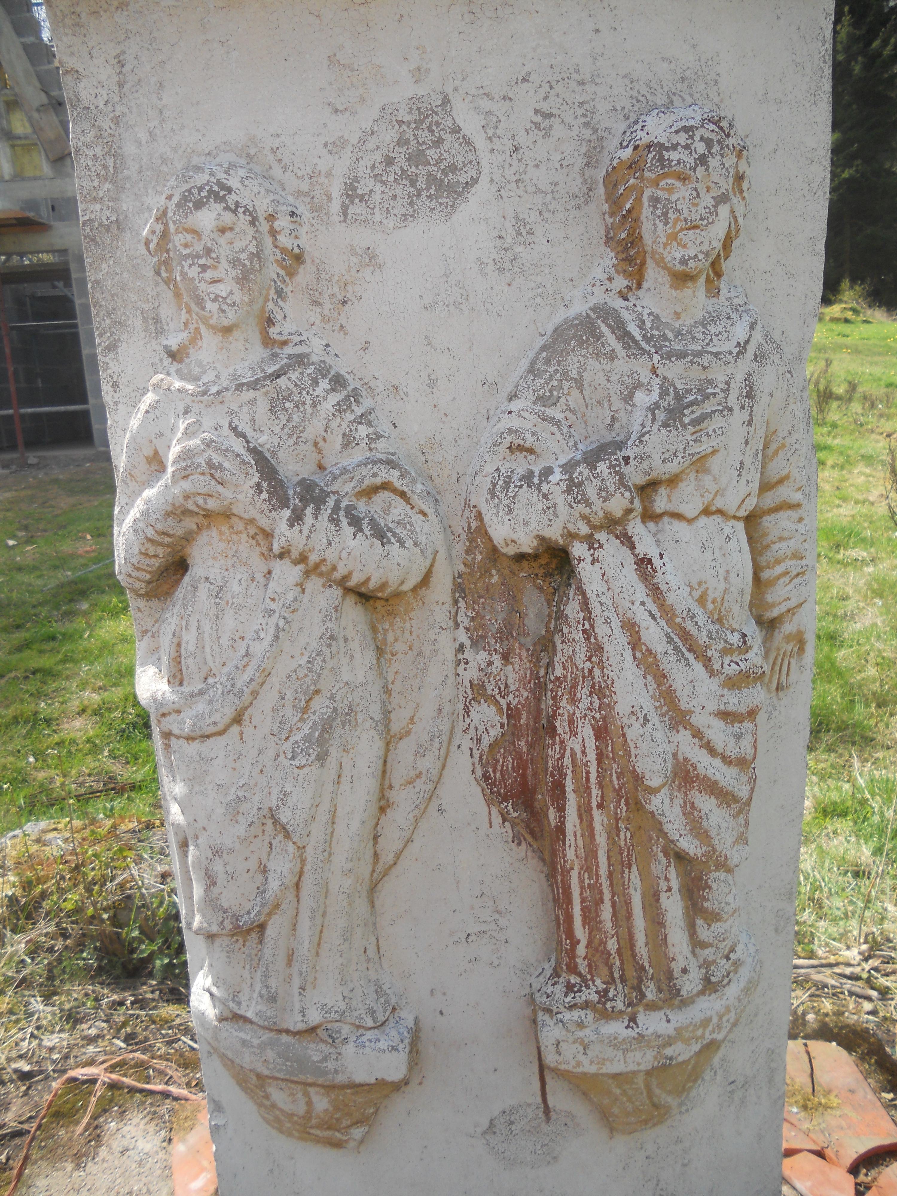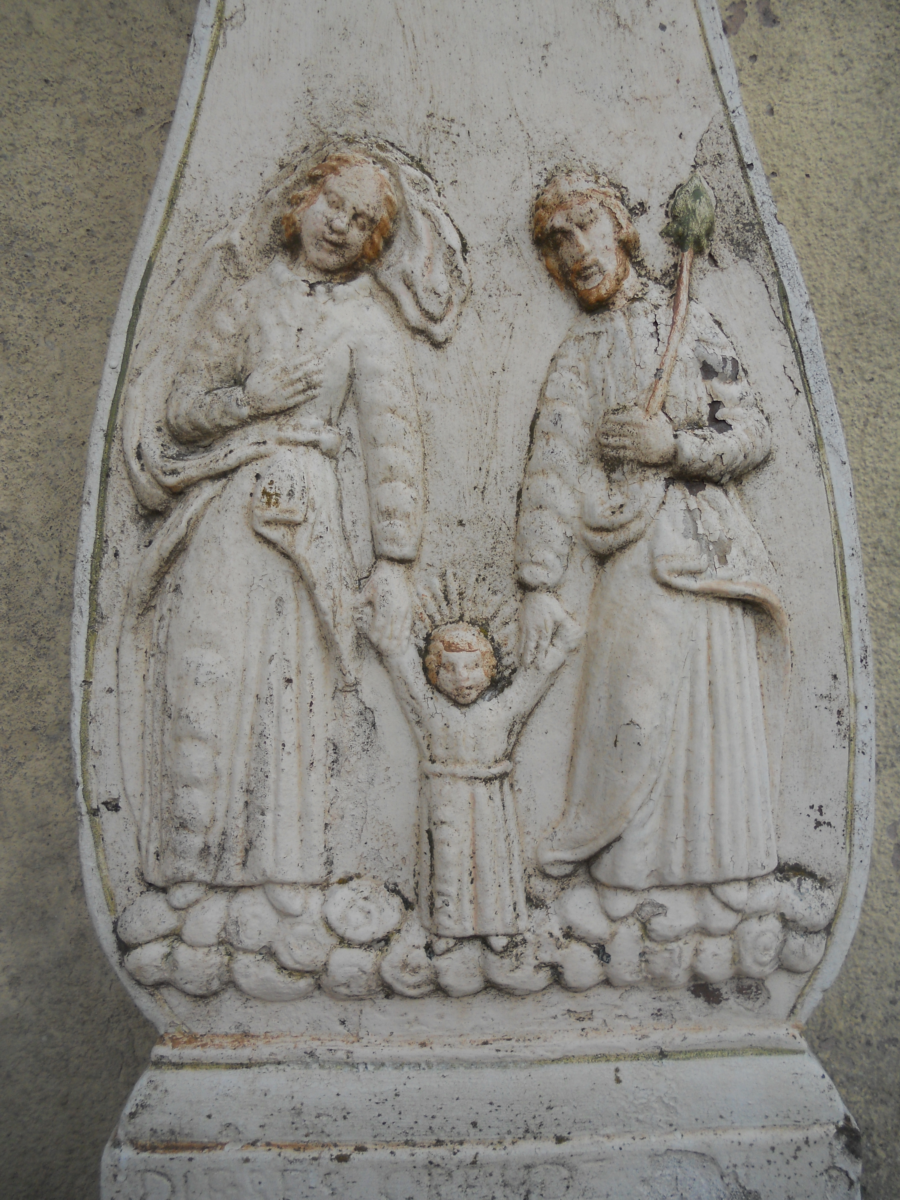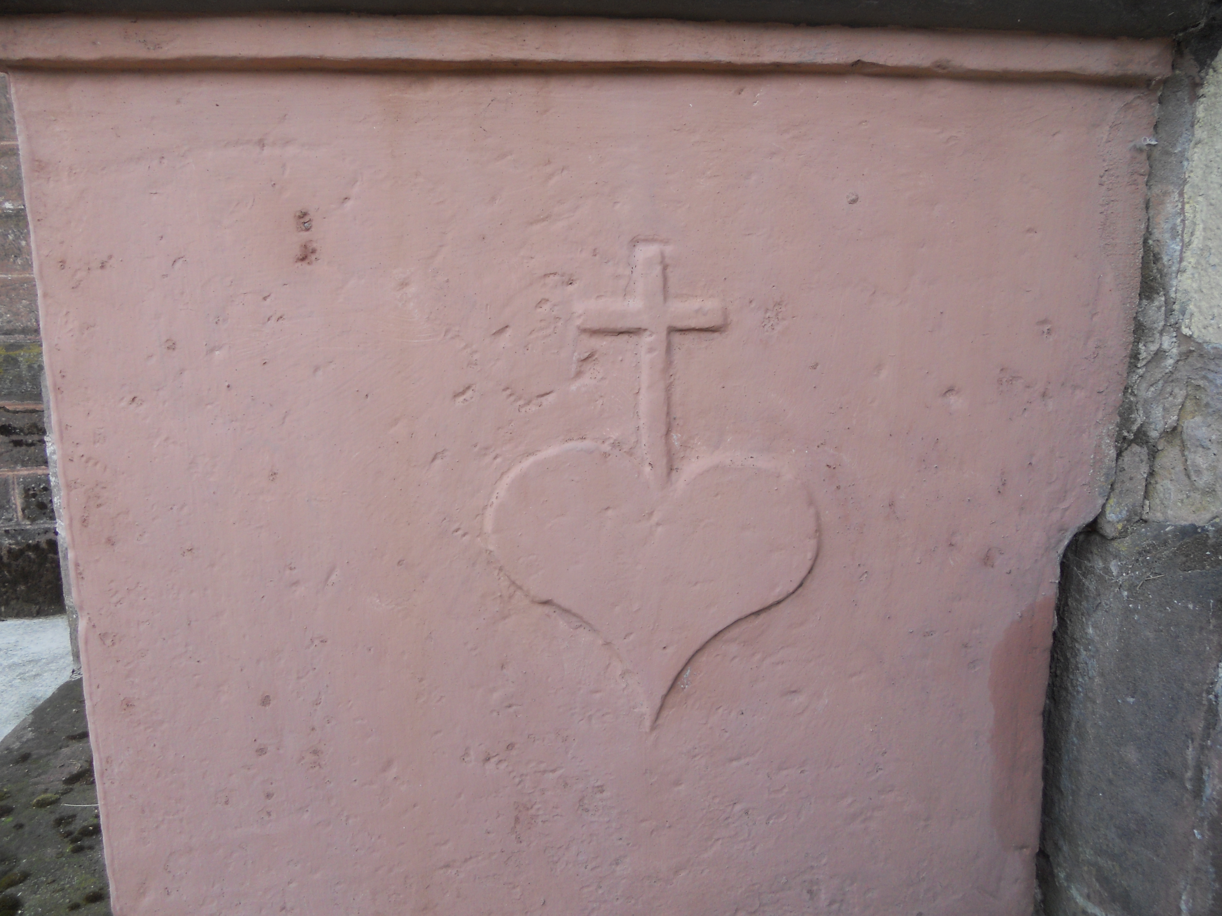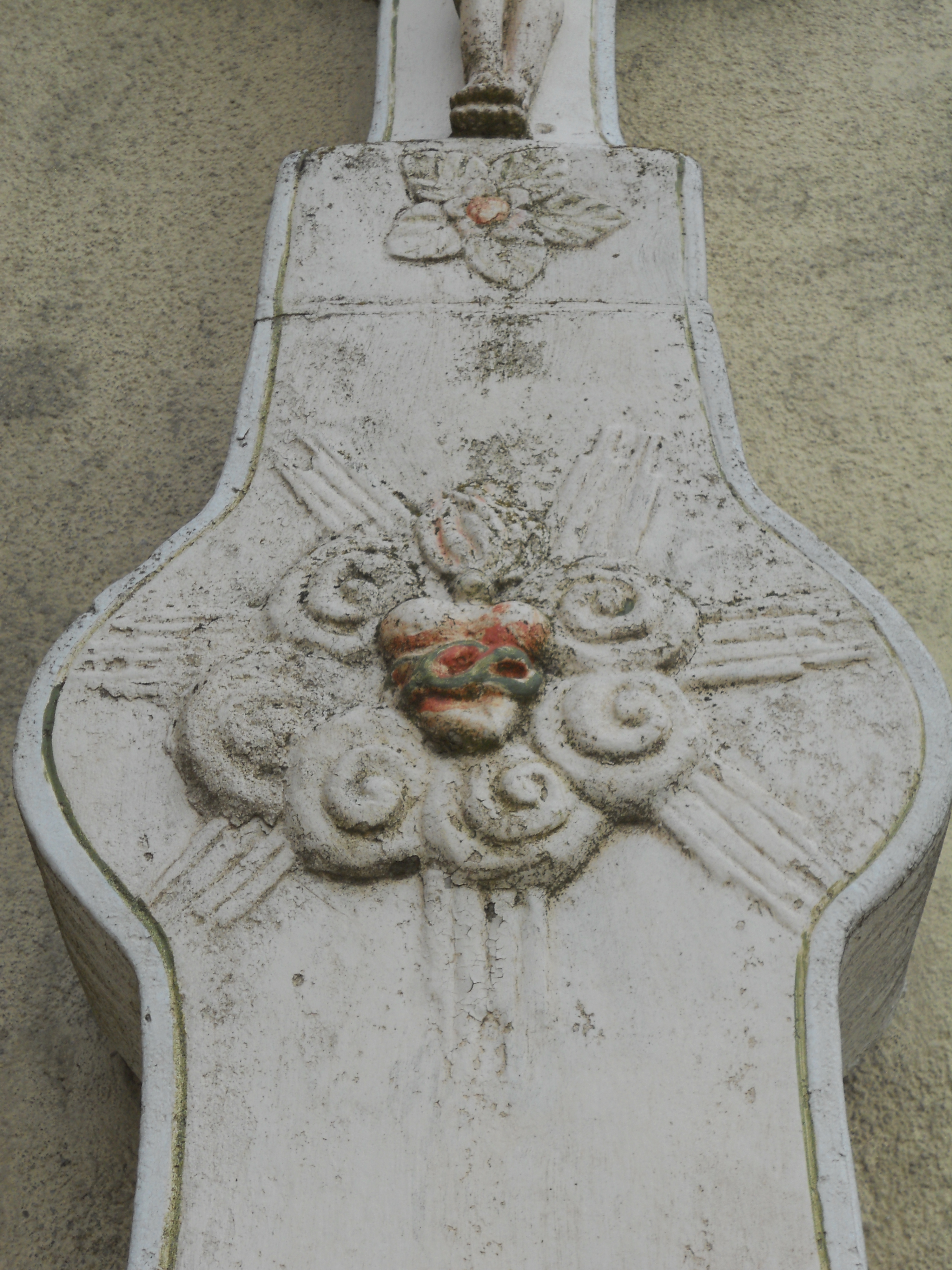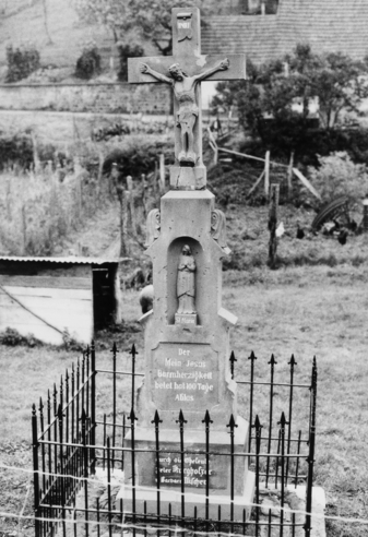 l'entrée. Un socle en grès rose est surmonté d'une croix en bois, portant un
