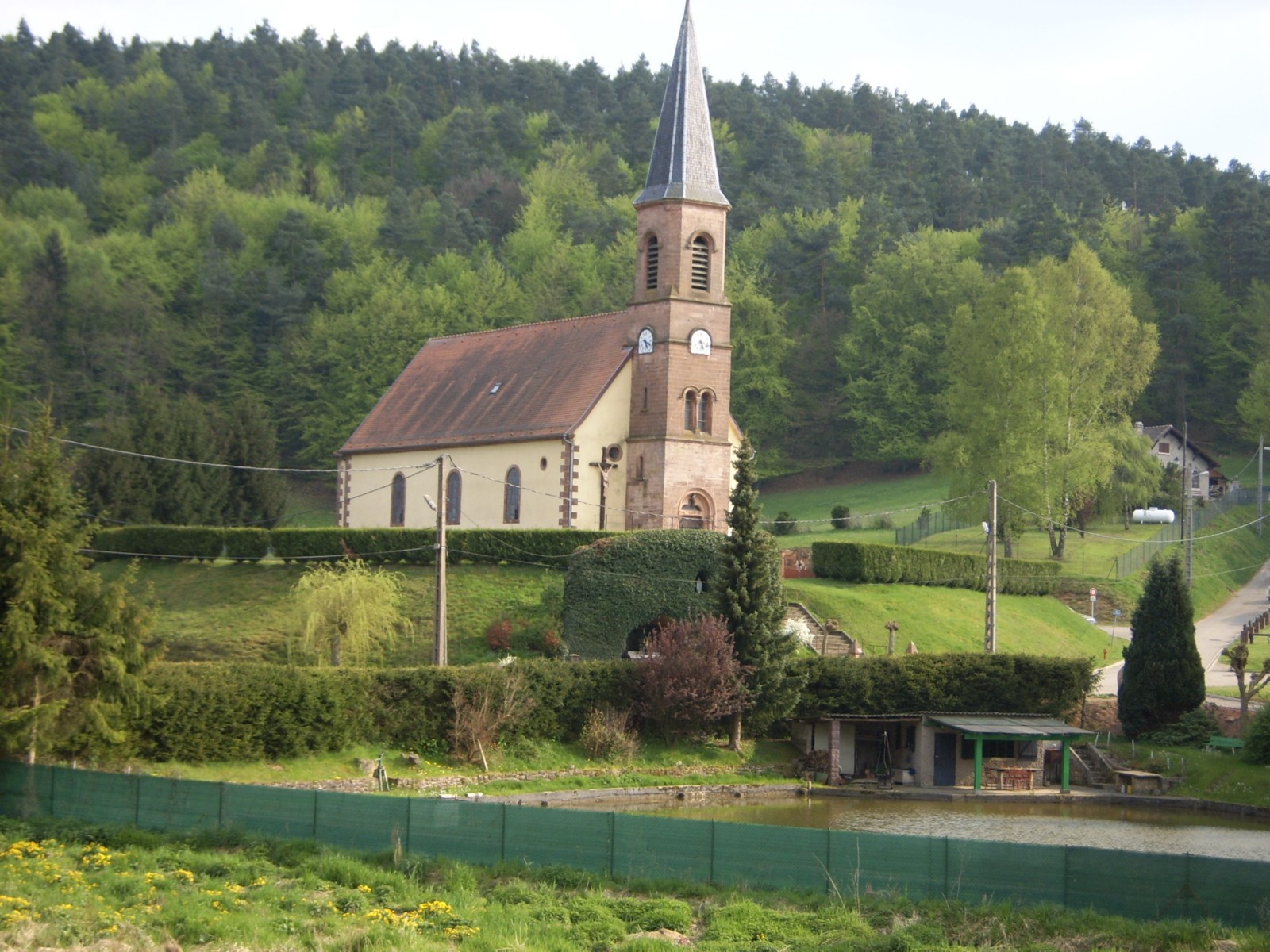 II. ÉdificeDédiée à l'Assomption de la Très Sainte Vierge, l'église paroissiale est de type église-grange de plan allongé, avec vaisseau unique et chevet polygonal. Elle est construite en 1791 alors que la tour-clocher de style roman, hors-œuvre en façade, est ajoutée dans la seconde moitié du XIXe siècle. Curieusement placée à l'écart de l'axe principal de l'agglomération, l'église surplombe le village au Sud. Construite en grès, moellon, enduit et pierre de taille, elle présente un toit à longs pans, avec croupe et flèche polygonale, recouvert d'ardoise.