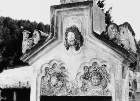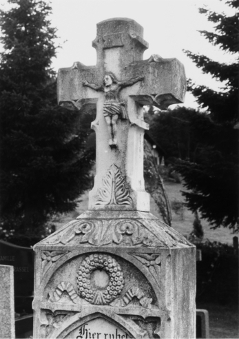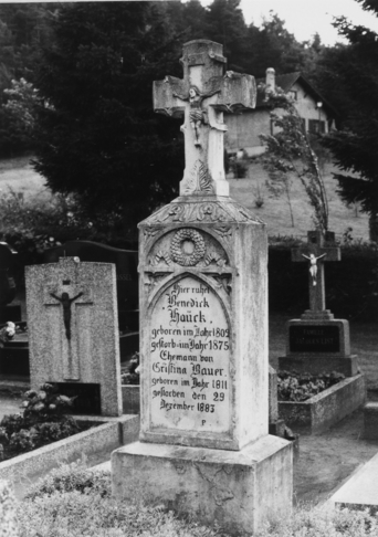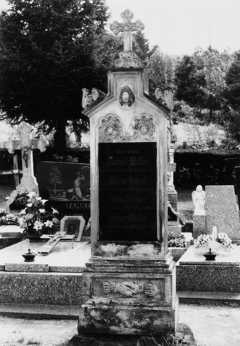 Une croix de cimetière est adossée à la façade de l'église paroissiale, à droite de la tour-clocher, tandis qu'une croix de mission, est située à gauche. Plusieurs monuments funéraires intéressants sont encore situés dans le cimetière communal.Le tombeau de la famille Müller est érigé vers 1875. En grès sculpté, il représente la tête du Christ au sommet du fût-stèle, dominée par le croisillon. Deux têtes d'angelots ailées trônent au dessus de la plaque renseignant les noms des défunts, tandis que deux mains serrées sont figurées à la base du fût (3). Une autre tombe, celle de Benedick Hauck et de son épouse Christina Bauer, en grès sculpté, présente un décor néogothique. Le fût-stèle, dominé par un croisillon, nous montre un décor végétal ainsi qu'une couronne de perles (4).