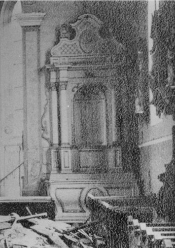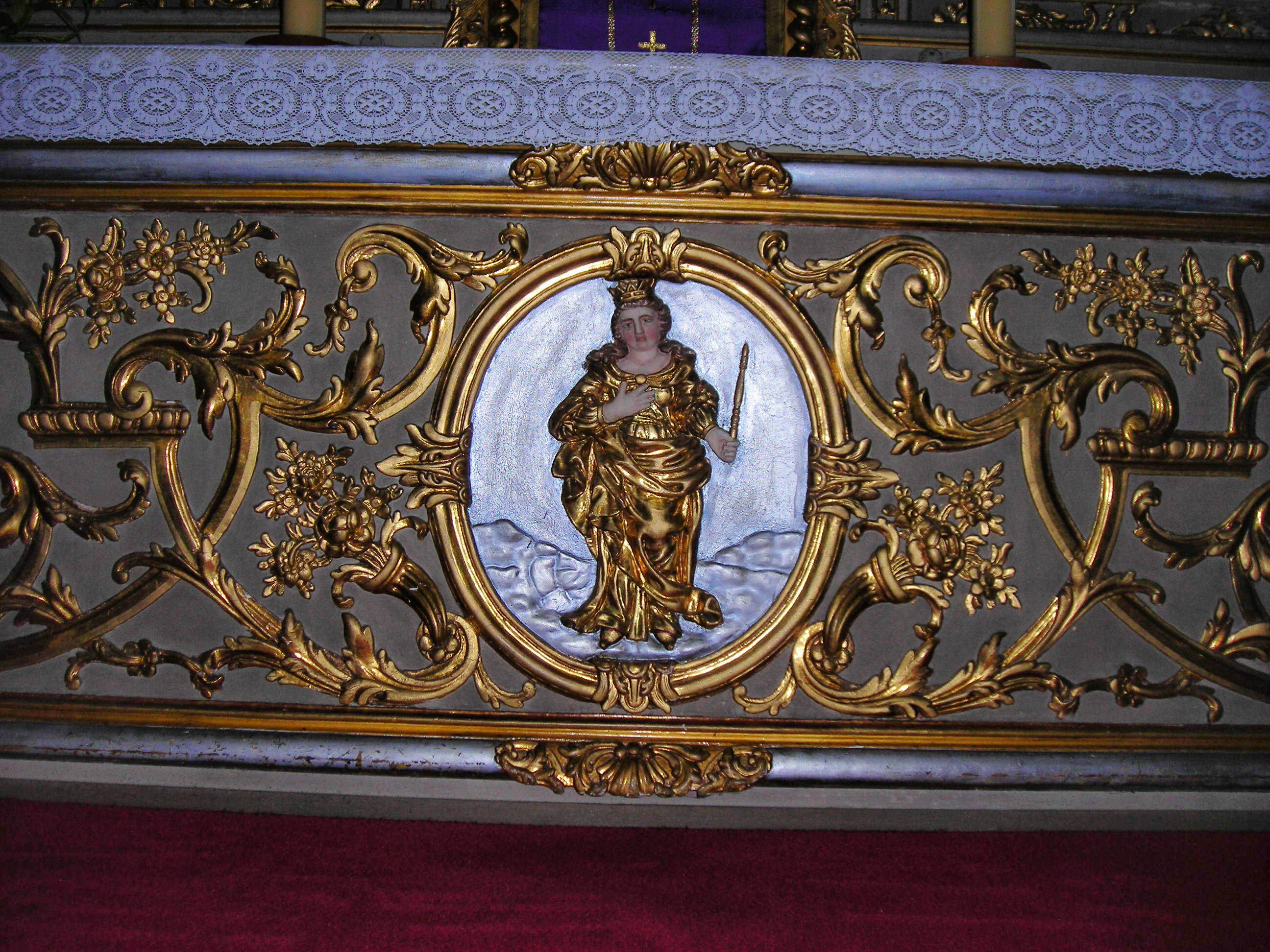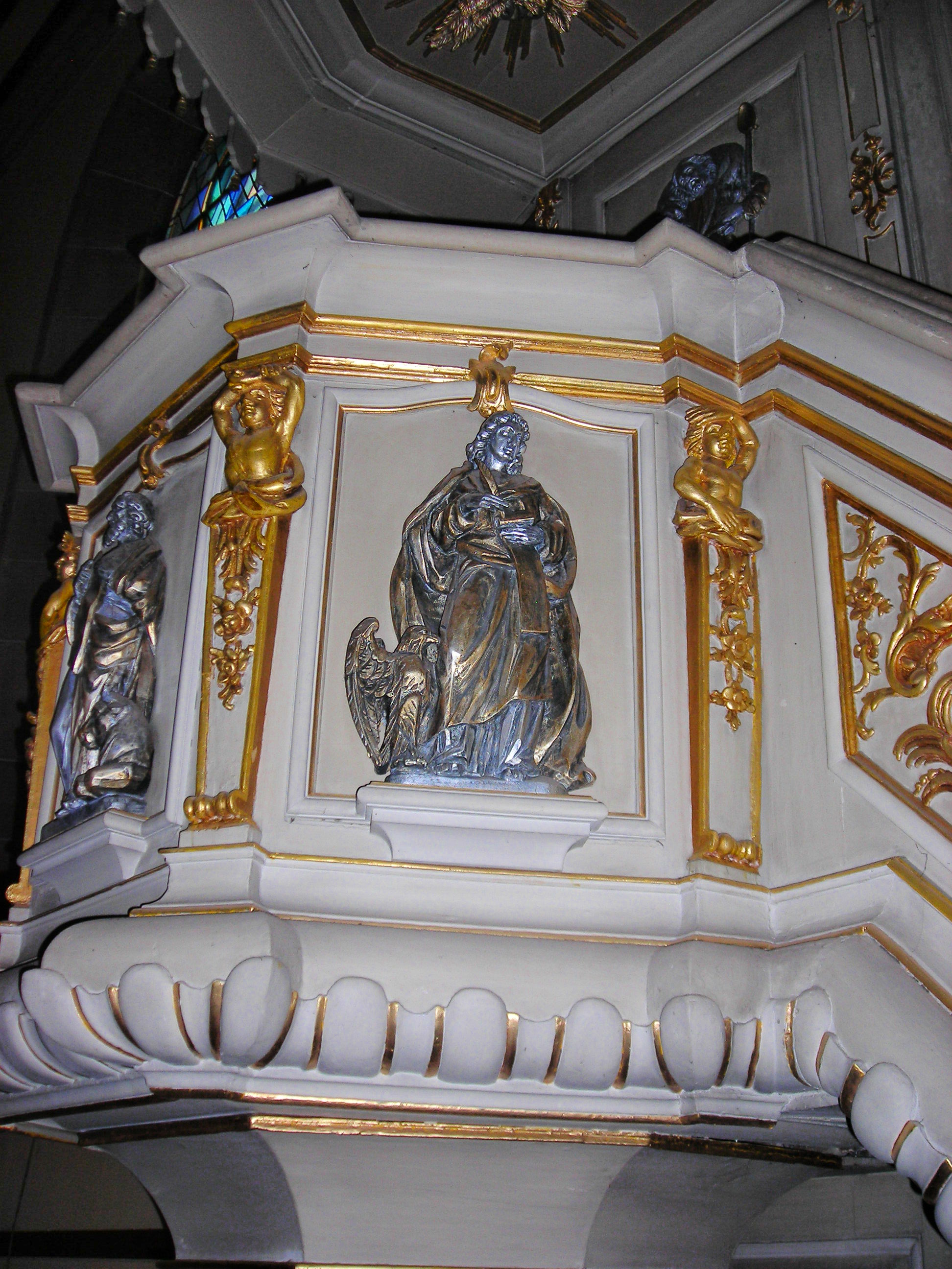 Un bas-relief en bois peint, suspendu au mur gauche de l'entrée, provient sans doute des anciens fonts baptismaux avant la seconde guerre mondiale. Datant sans doute du quatrième quart du XVIIIe siècle, il représente saint Jean-Baptiste baptisant Notre-Seigneur, tandis que la colombe du Saint-Esprit émerge de la nuée.