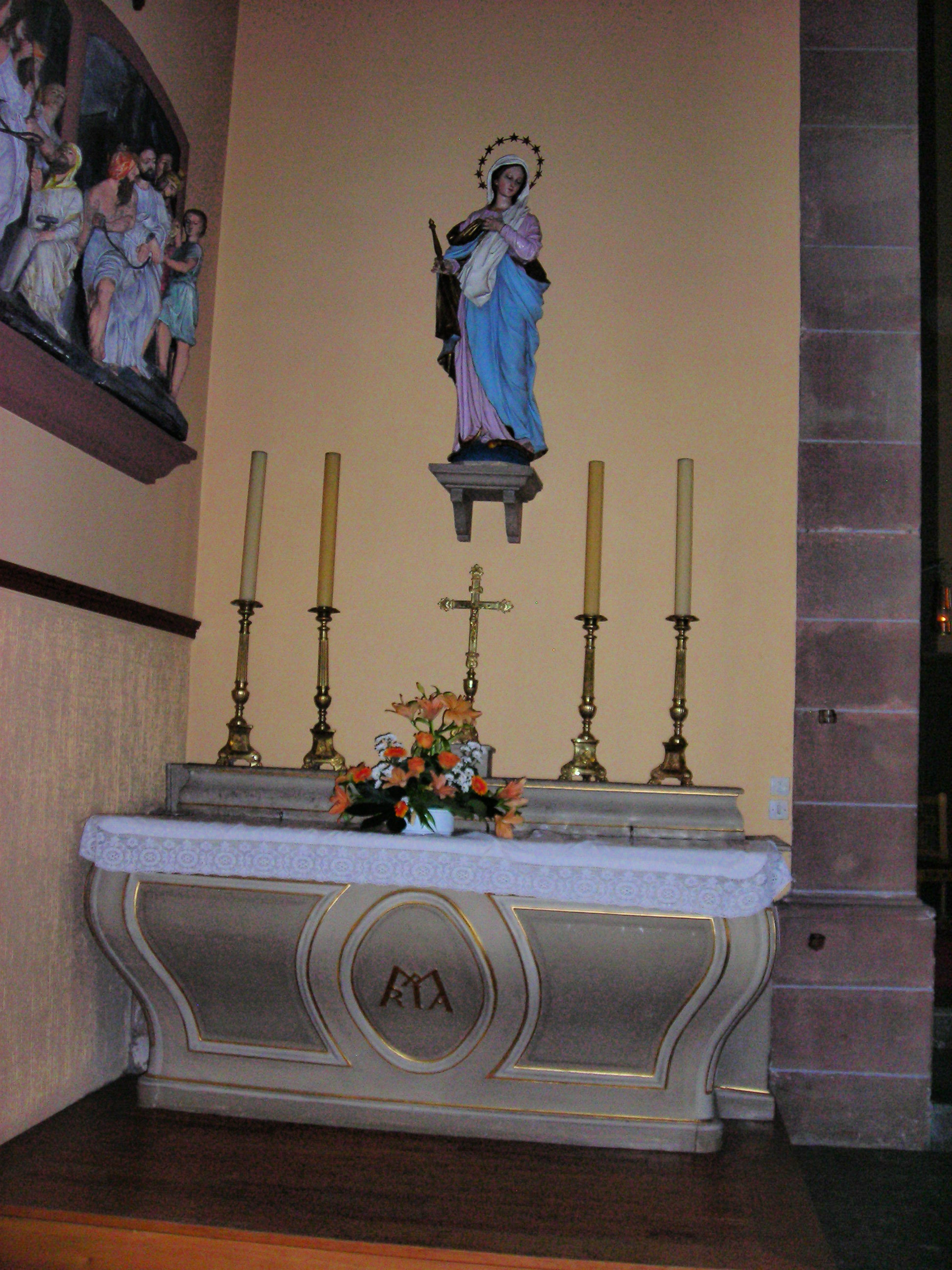 L'origine des autels latéraux, dédiés à l'Immaculée Conception et à saint Joseph, n'est pas clairement établie : ils pourraient être réalisés pour la nouvelle église de Schorbach, ou bien être rachetés, comme la chaire à prêcher, à une autre église, la paroisse de Bitche peut-être. Se situant de chaque côté de l'arc triomphal, les autels secondaires sont abîmés durant la seconde guerre mondiale et les retables sont supprimés, subsistent seulement les tombeaux. En bois peint et doré, ils présentaient un décor de réticulé à fleurettes sur le fronton des retables.