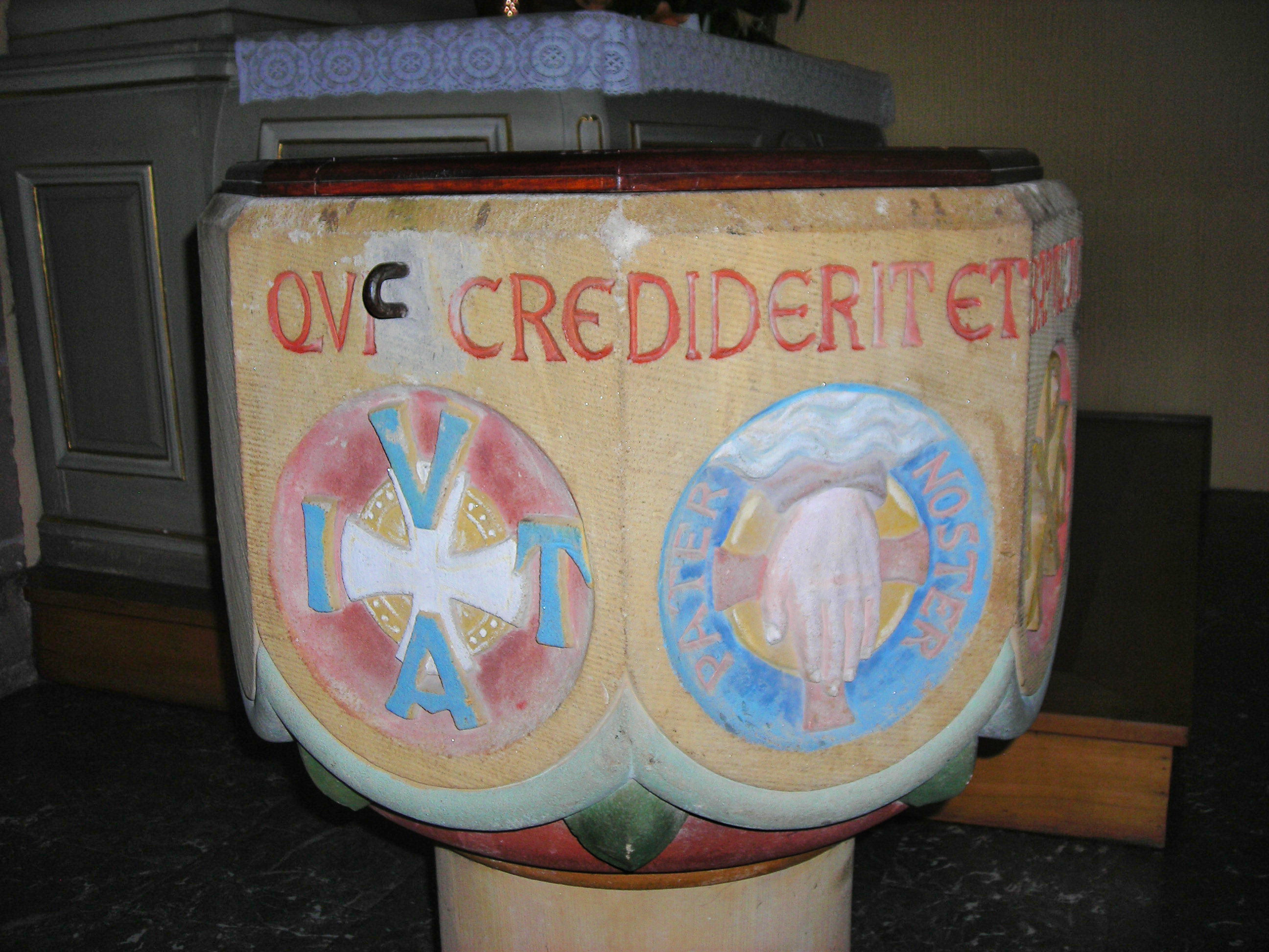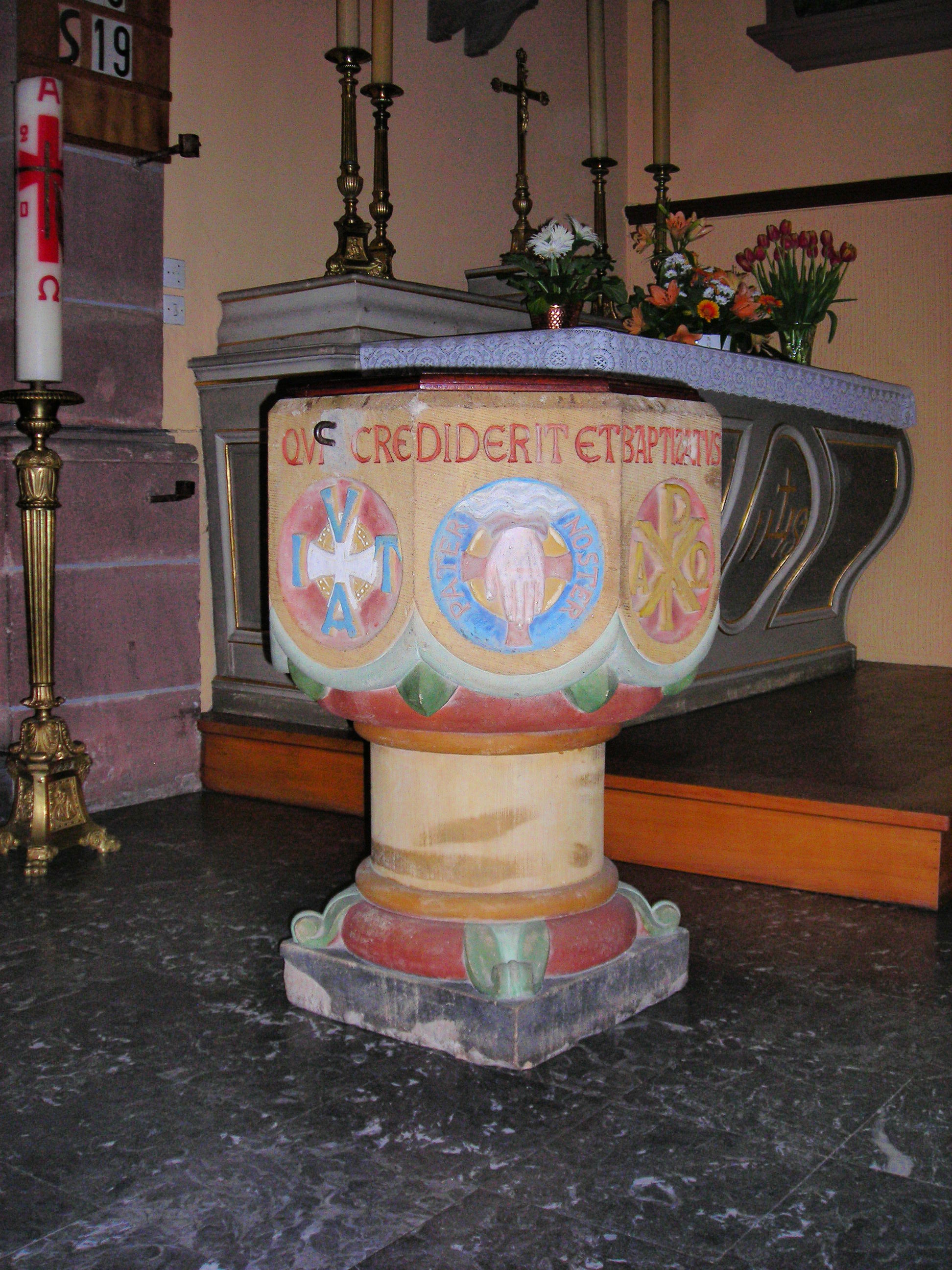 Les très beaux fonts baptismaux, en grès sculpté et peint en polychromie, sont datés 1923. Situés devant l'autel latéral de saint Joseph, ils figurent diverses représentations iconographiques telles que la Croix, l'alpha et l'oméga, le chrisme et la main de Dieu.