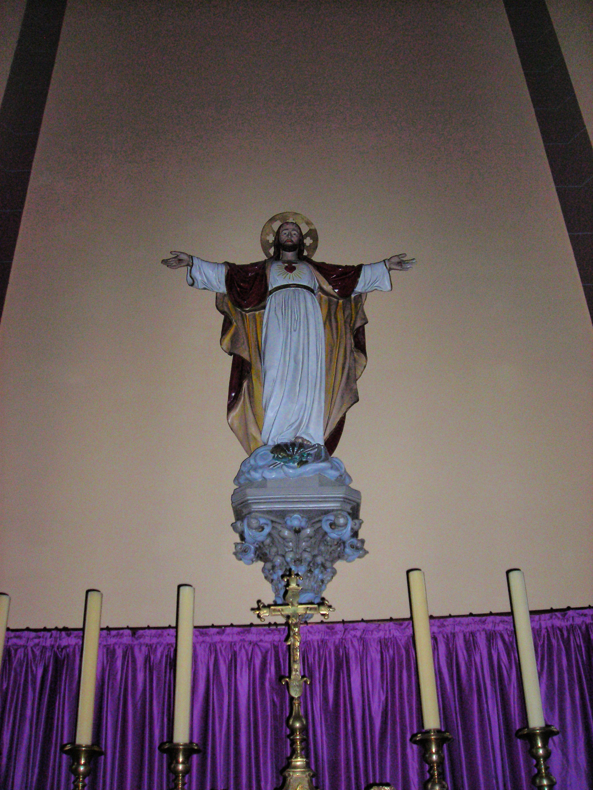 L'église contient plusieurs statues. Le Christ en Croix occupe le mur Sud de la nef et une statue du Sacré-Cœur trône dans le chœur, au dessus du maître-autel. Les autels latéraux sont surmontés des statues de l'Immaculée Conception de la Très Sainte Vierge et de saint Joseph, respectivement à gauche et à droite. Sous la tour-clocher, un groupe sculpté représente la Vierge de Pitié.