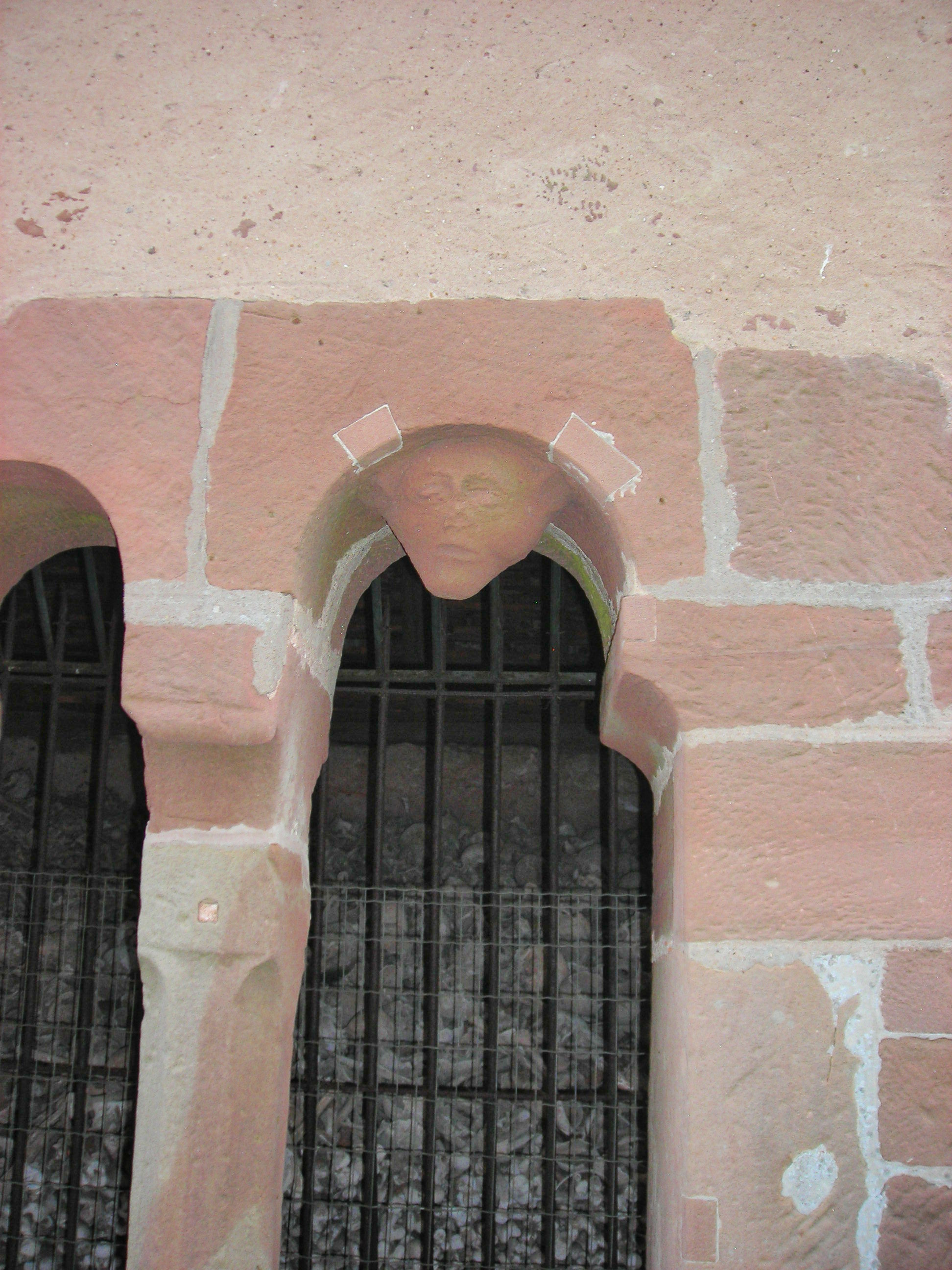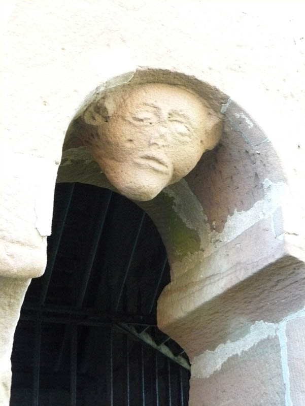 Les deux masques grimaçants entre les colonnettes de l'ossuaire