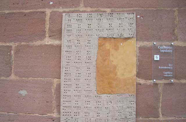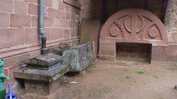 Devant l'église se trouve un tympan roman, provenant sans doute du portail principal de l'ancienne abbatiale et jadis remployé dans la façade de l'ancien bras gauche du transept, transformé en bâtiment agricole, au-dessus du portail latéral. Il est remonté dans le cimetière après 1961, le bâtiment agricole, qui menaçait ruine, ayant été détruit. Le tympan est désormais déposé contre l'église. Taillé dans le grès rose, il présente une riche ornementation sculptée d'inspiration essentiellement géométrique : au centre, une croix à décor de réticulé et de quatre-feuilles s'inscrit dans un cercle, dans les écoinçons, des rosaces, l'ensemble évoquant peut-être le firmament mystique.