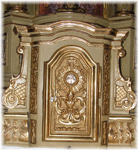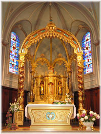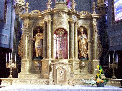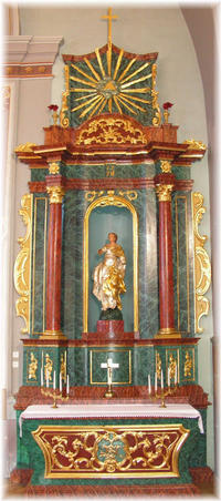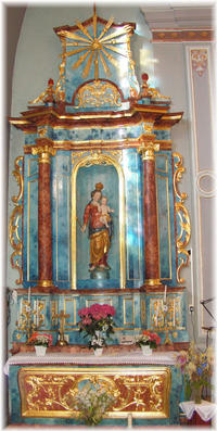Le maître-autel et l'autel latéral gauche, dédié à la Très Sainte Vierge Marie, sont réalisés entre 1754 et 1758, sans doute par le sculpteur Jean Martersteck (1691-1746) ; originaire de Bouquenom (Sarre-Union), celui-ci est venu s'installer en 1735 dans le village de Wœlfling-lès-Sarreguemines, aux portes du pays de Bitche. Il est également l'auteur des très beaux autels de l'église de la Très Sainte-Trinité de Loutzviller et de la chapelle Saint-Vincent-de-Paul d'Urbach. Ce n'est qu'en novembre 1776 qu'un marché est passé par les échevins de la paroisse Saint-Didier avec Dominique Labroise, sculpteur à Sarrebourg, pour la confection de l'autel de sainte Agathe, « identique à l'autel de la Vierge en hauteur, largeur, dorure et sculpture ». À quelques détails techniques près, les autels sont en effet semblables, mis à part le galbe du tombeau, plus accentué dans celui de Labroise. Abrité par un baldaquin tardif, de la fin du XIXe siècle ou du début du XXe siècle, le maître-autel est composé d'un autel galbé en élévation supportant un tabernacle. Une exposition pivotante, encadrée de niches, se développe en hauteur et en largeur derrière celui-ci. Sur le devant d'autel est figuré l'arche d'alliance au milieu d'un décor rocaille et de chutes de fleurs, tandis qu'un ostensoir est sculpté en bas-relief sur la porte du tabernacle inférieur. Jusqu'à la seconde guerre mondiale, un dais d'où s'échappaient des guirlandes de fleurs amortissait l'ensemble, conférant des proportions plus équilibrées à l'autel.