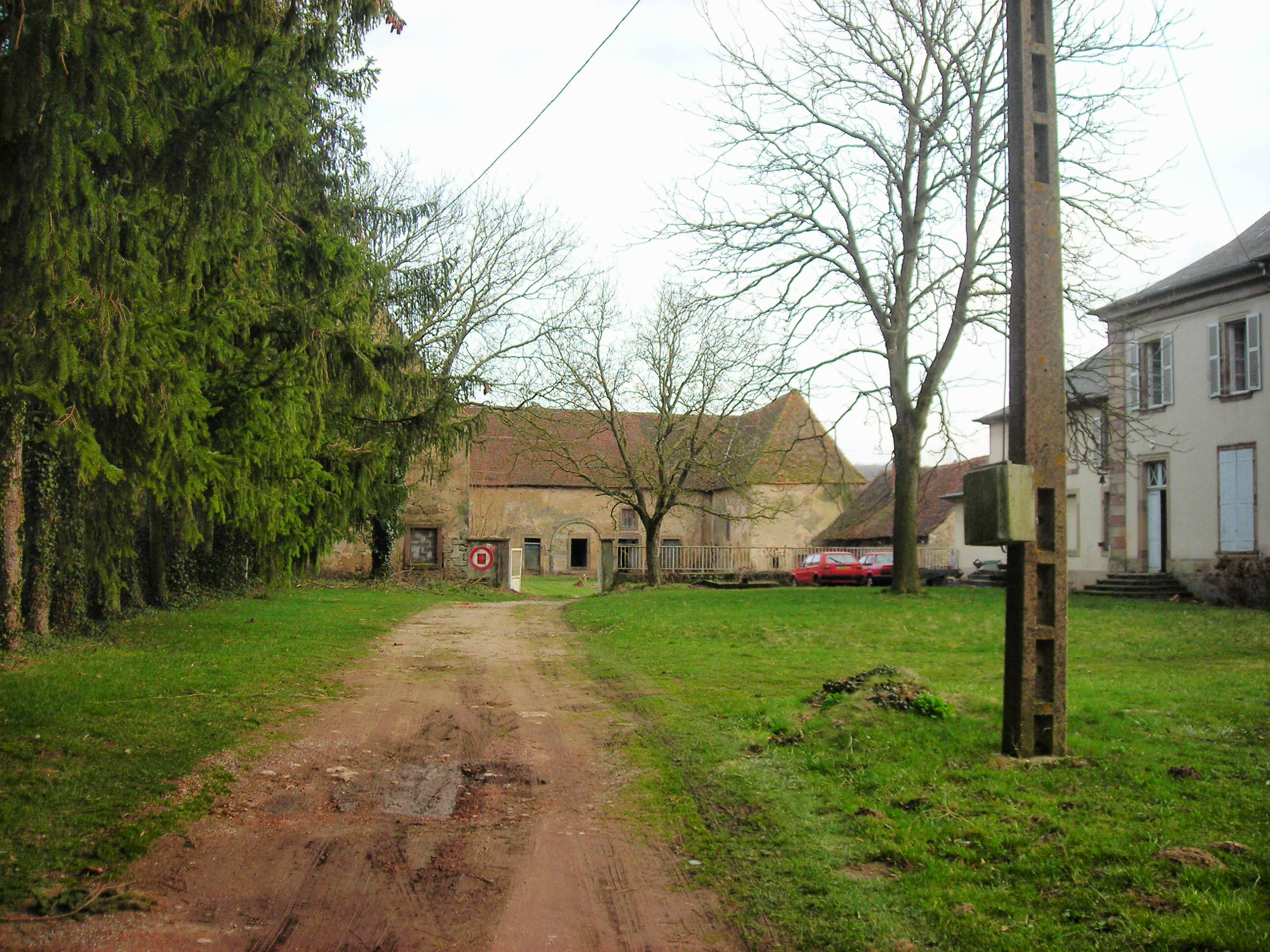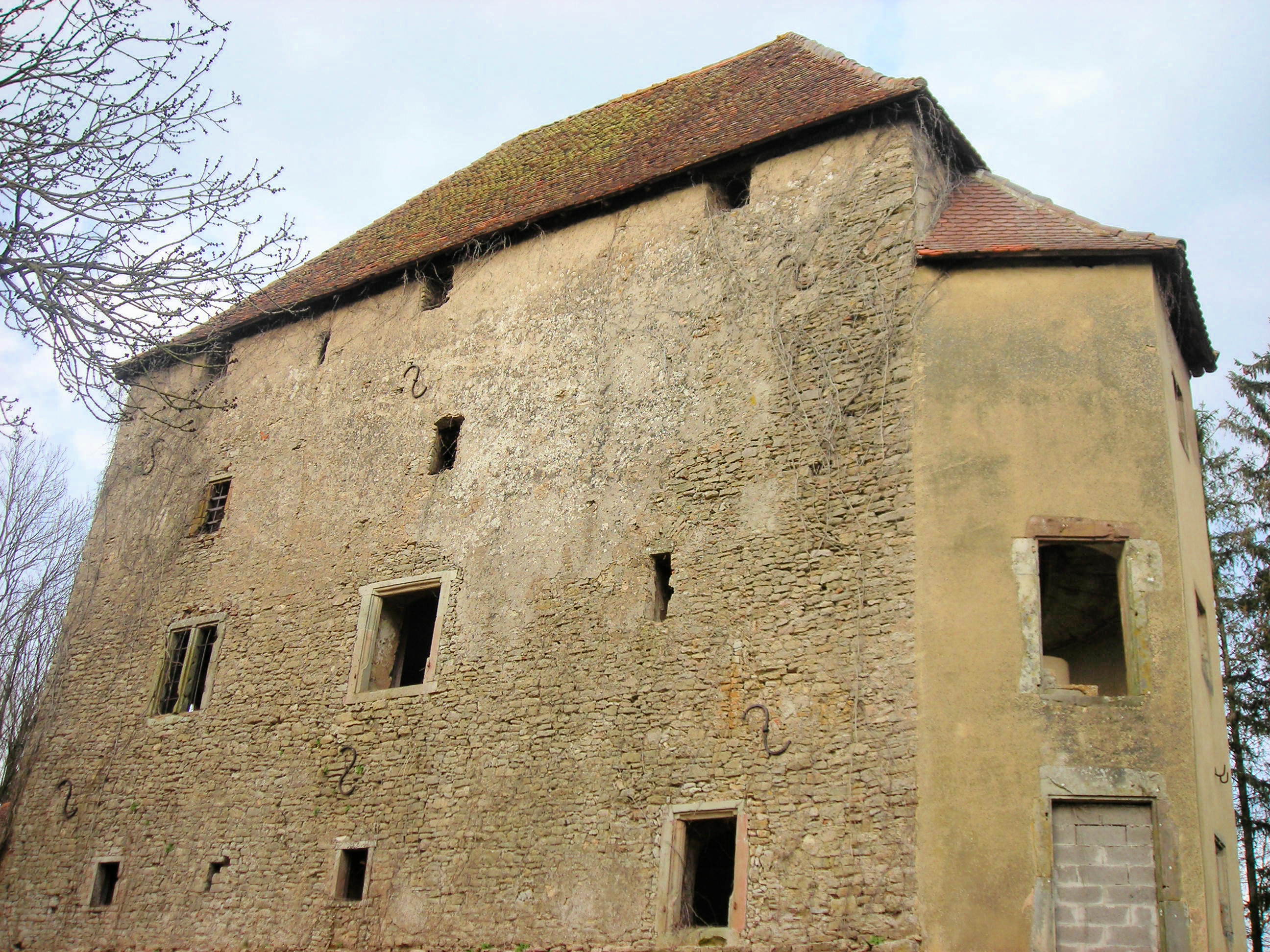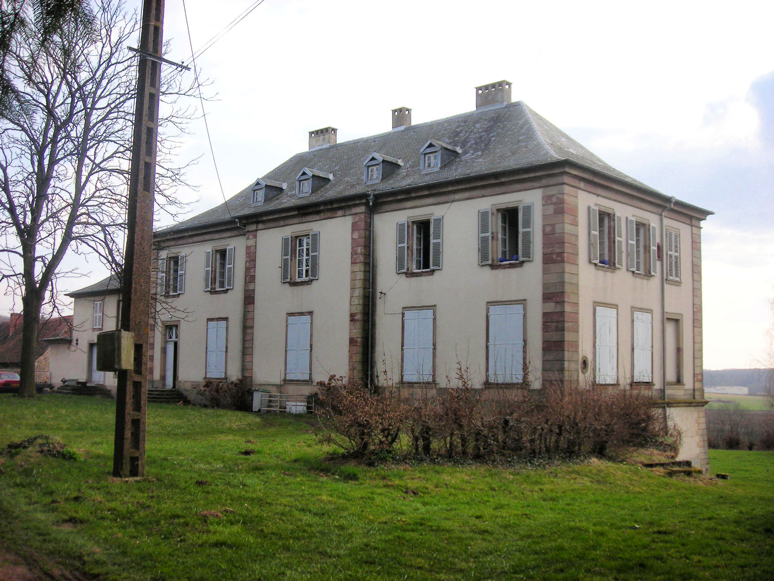 Au château primitif de la famille de Weidesheim détruit en 1380 succède un édifice reconstruit au milieu du XVe siècle et transformé à la fin du même siècle par Simon de Bitche l'ancien, qui fait aussi relever la chapelle. En 1728, la seigneurie est acquise par Pierre d'Hausen dont les descendants conservent encore le domaine. Du château du XVe siècle, il subsiste la tour, qui semble apparentée aux Turmburgen allemands. Ce haut bâtiment de plan massé, comportant quatre niveaux d'ouvertures, est couvert d'un toit à longs pans et croupes à forte pente et tuiles plates. Accolée à la façade sud, la tour de l'escalier en vis, à comparer avec celui du proche château de Rahling daté 1620, est rajoutée au XVIe siècle ou au XVIIe siècle, à l'époque où l'édifice est partiellement repercé. Des bâtiments agricoles très remaniés, dotés de canonières doubles du XVIe siècle, ferment la cour du XVIe siècle. Ils sont précédés à l'Ouest par le nouveau château de style néoclassique reconstruit à la veille de la Révolution française pour Dominique Ignace Charles d'Hausen, conseiller au Parlement de Metz, futur député de la Moselle et maire de Sarreguemines.