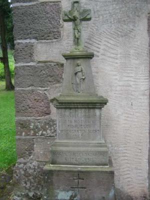 Une croix monumentale en grès sculpté est élevée en 1826, date portée par le socle, et adossée à la façade principale de la chapelle, à droite de la porte. Elle est érigée par Christian Stockhober et son épouse Odile Undreiner. Le socle est droit, le fût-stèle galbé en plan et le croisillon en croix latine. Elle représente le Christ en Croix, ainsi que les symboles funéraires de la tête de mort et du tibia. Le socle porte l'inscription suivante : « Errichtet zur Ehre Gottes von Christian Stockhober un seiner ehe Frau Odilia Undereiner 1826 ». Le fût est orné de la figure de saint Jean Népomucène ou Johannes Nepomuk ; cette iconographie, habituellement liée à l'eau, s'explique peut-être ici par la proximité du village de Montbronn, où ce saint était particulièrement vénéré. À gauche de la porte d'entrée se trouve une croix plus petite, qui est érigée après la seconde guerre mondiale, en remerciement pour le retour de deux frères partis au front.