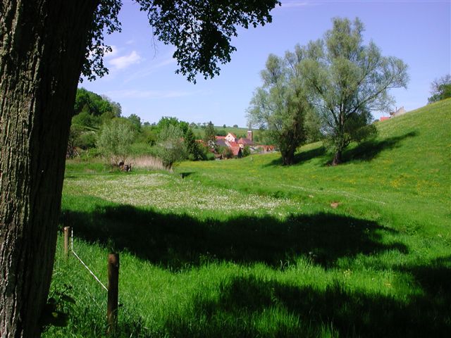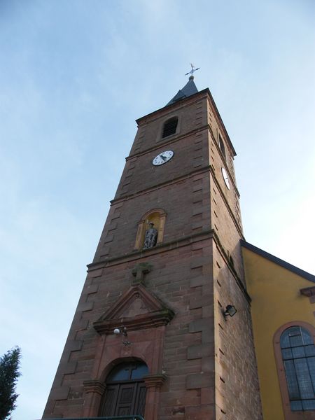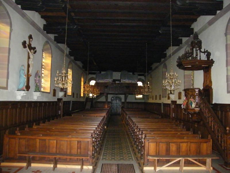 II. ÉdificeUne chapelle, dédiée à saint Hubert, est construite en 1779 aux frais des habitants, du fait de leur éloignement de l'église-mère de Loutzviller. L'édifice est agrandi en 1859, et une tour-cloher hors-œuvre en façade est construite aux frais de la fabrique. Endommagé pendant la guerre de 1939-1945, l'édifice est restauré entre 1947 et 1951. De plan allongé et à vaisseau unique, il s'agit d'une église-grange à chevet polygonal, en grès, moellon et pierre de taille. L'édifice possède un toit à longs pans, avec croupe et flèche carrée, recouvert de tuiles plates et d'ardoises.