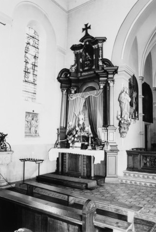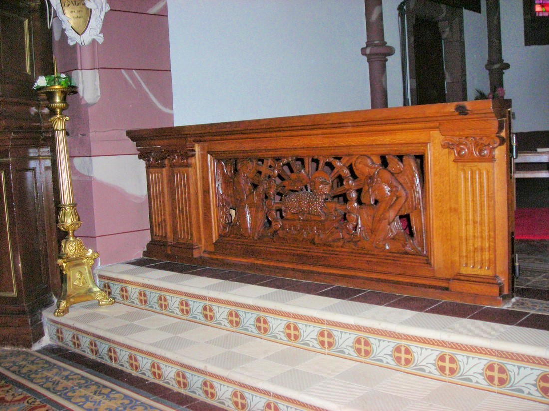 Le chœur est encore délimité par un beau banc de communion en bois sculpté : les deux portillons permettant d'en fermer l'accès ont été détachés du banc et apposés contre la face du nouvel autel, permettant ainsi de lui donner un minimum de cachet supplémentaire. Le banc de communion reprend le même thème iconographique que le tombeau du maître-autel : l'Agneau pascal est adoré par les anges.