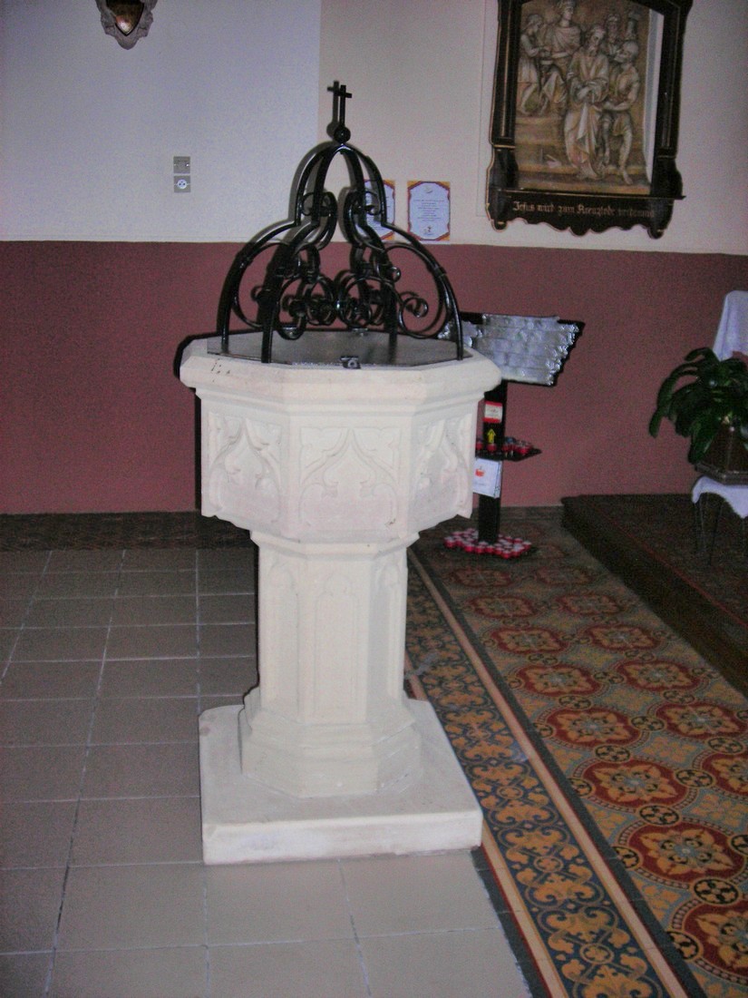 Le baptistère, en pierre pour le socle et la cuve et en fonte pour le couvercle, est situé devant l'autel latéral gauche.