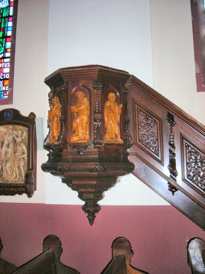 Une chaire à prêcher est adossée au mur Ouest de la nef : en bois et sans abat-voix, elle est décorée de bas-reliefs représentant les quatre saints Évangélistes sur les faces de la cuve.