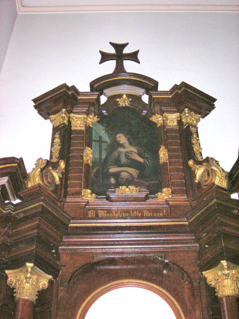 Deux autels latéraux avec retables, en bois peint et doré, sont installés après 1854 dans l'édifice, de part et d'autre de l'arc triomphal : les statues des retables sont celles de la Vierge de Pitié à gauche et de saint Vincent de Paul à gauche, tandis que les frontons représentent sainte Marie-Madeleine à gauche (peinture qui pourrait être une variante du tableau de Guido Reni) et saint Jean-Baptiste à droite.