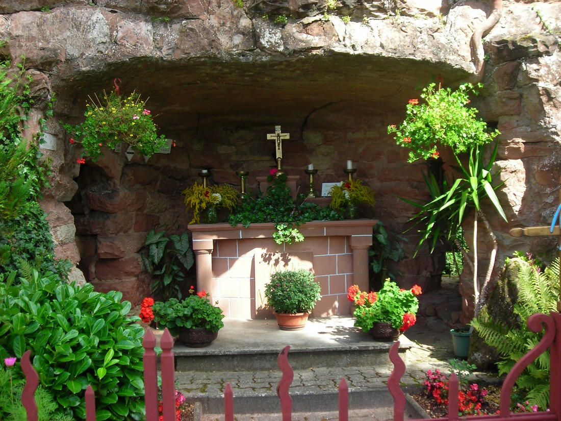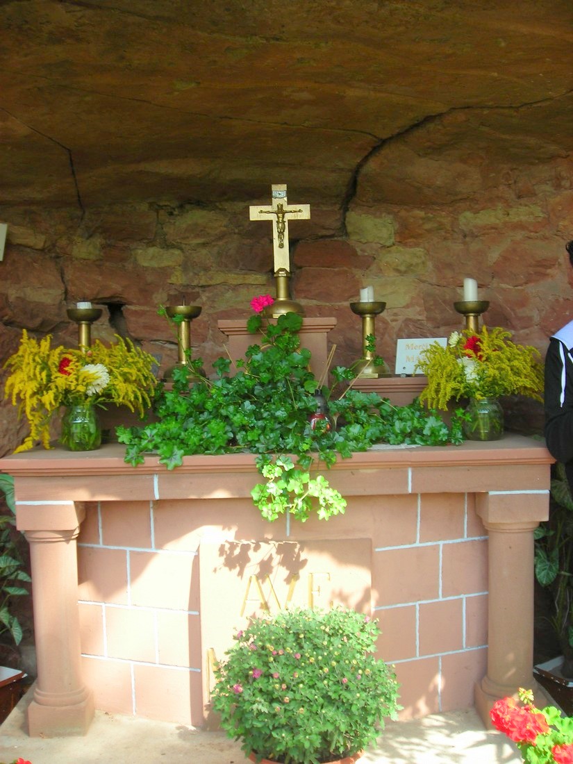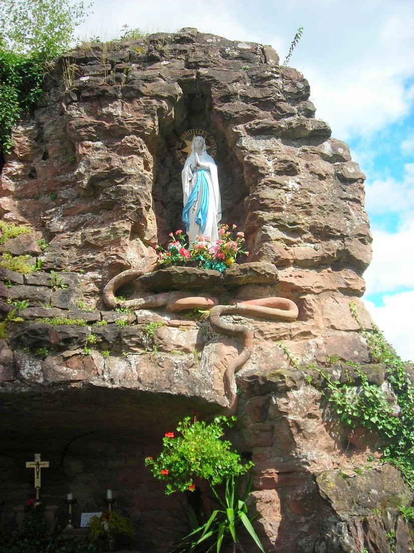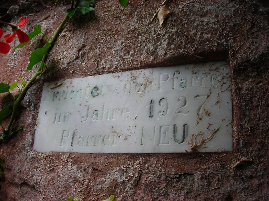Elle restait une énigme pour moi, cette grotte si agressivement politisée. L'année 1927, année de sa bénédiction ne se comprend que si l'on connaît le contexte que j'ai essayé succinctement de résumer à l'instant. Et puis Joseph Krebs de Rohrbach, qui l’érigea, avait une sœur, Anna, qui avait épousé à Rolbing Georges, le frère de Jean Dumser. Comment ne pas voir, derrière le symbolisme dont elle est porteuse et dont nous allons parler, les conseils avisés de l’ardent militant autonomiste dont nous venons de relater l'histoire, ou peut-être de l’influent curé Sacksteder de Schweyen, son confident, signataire du manifeste du Heimatbund, et qui avait eu à subir, quelques années auparavant, la dure épreuve de la fameuse " Schulaffär " ? Schweyen n'est qu'à 4 km de Rolbing. Joseph Krebs est par ailleurs le cousin de Victor Krebs, seul citoyen de Rohrbach à avoir signé le manifeste du Heimatbund.