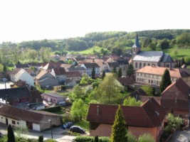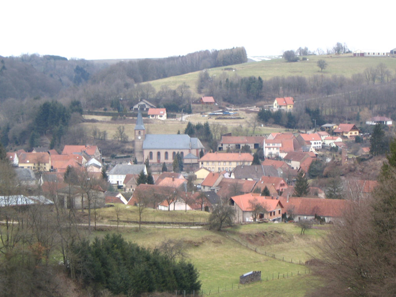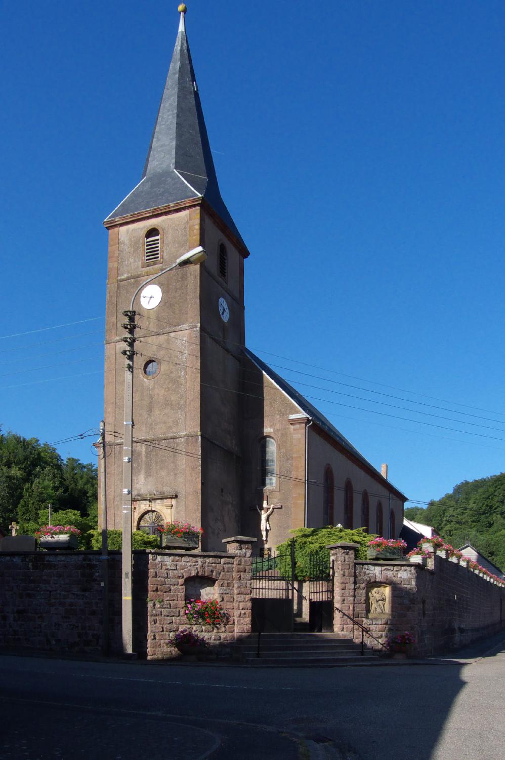 L'église, dédiée à saint Benoît de Nursie et devenue insuffisante, est détruite en 1754 puis reconstruite en 1785. La tour-clocher, construite hors-œuvre en façade et datée 1754, est conservée à cette époque mais exhaussée aux frais des paroissiens. De même, ils font construire la sacristie, ainsi qu'un ossuaire et mettent en état les murs et les portes du cimetière. Endommagée pendant les violents combats et bombardements de la seconde guerre mondiale, l'église est restaurée par la suite. Il s'agit d'un édifice à plan allongé à chevet polygonal, de type église-grange, comportant une flèche polygonale.