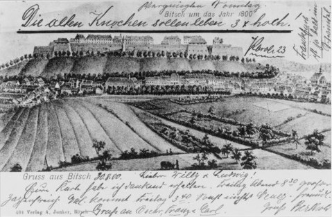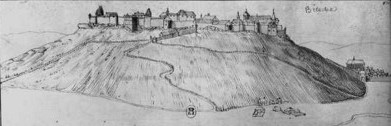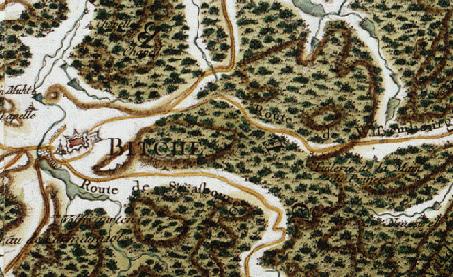 La première mention du nom de Bitis se trouve dans une lettre datée du milieu de XIIe siècle et dans laquelle le duc de Lorraine Matthieu Ier demande au comte de Sarrewerden de respecter les limites ainsi que les habitants de sa seigneurie. Dans cette lettre, écrite en lettres gothiques mais en latin, les limites de cette seigneurie sont parfaitement établies. Dès 1170, un Bitis Castrum (château de Bitche) apparaît dans un document où Frédéric Ier se dénomme lui-même Dominus de Bites, seigneur de Bitche. Il est plus probable que ce Bitis castrum soit un pavillon de chasse, situé dans la proche forêt de Lemberg (1). Il semble qu’à la même époque, sans qu’il soit possible de dater l’événement, un autre pavillon est construit sur le Schlossberg à l’emplacement de l’actuelle citadelle. L’intérêt stratégique de ce promontoire, avec vision panoramique sur plusieurs vallées, n’a pu échapper aux seigneurs de l’époque.